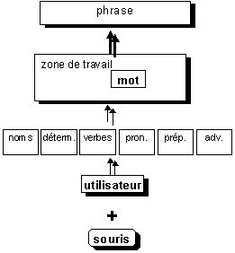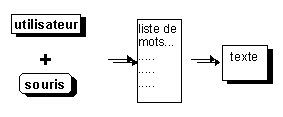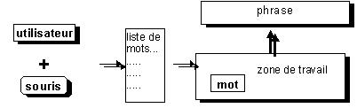 En parallèle avec la construction du modèle poursuivi, cette toute première étape a surtout pour but de vérifier la faisabilité du projet. C'est ainsi que sont étudiées les possibilités de déplacement des mots d'une liste à un espace graphique. À cette étape le but ultime du projet est la production d'un court texte utilisant ces stratégies de déplacements des mots. Le modèle utilisé est alors assez sommaire. La figure suivante en fait l'illustration.