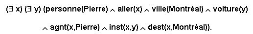 Par cette formule il est dit qu'il existe un x et un y tel que Pierre est une personne, x est est une instance d'aller, Montréal est une ville, y est une voiture, l'agent de x est Pierre, l'instrument de x est y et la destination de x est Montréal. (adapté de Sowa).