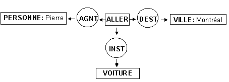On doit à Sowa (1984) la notion de graphe conceptuel. L'utilisation des graphes conceptuels permet de représenter les relations entre les divers éléments de la phrase. Dans le graphe conceptuel, la boîte contient le concept, le cercle, la relation et des traits orientés entre les divers éléments dirigent le sens de la lecture. La figure représente la phrase "Pierre se rend à Montréal en voiture".
