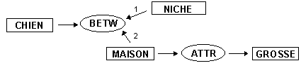 Une relation peut utiliser plusieurs arcs. Ainsi la relation entre (between) dans l'expression "chien entre la niche et la grosse maison" produira le graphe conceptuel suivant: