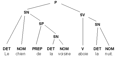 A l'aide de ces outils, il est possible de créer des règles assurant une représentation de la phrase: Ainsi, l'analyse de la phrase "Le chien de la voisine aboie la nuit" produira la suite de règles suivantes répondant à sa représentation: