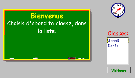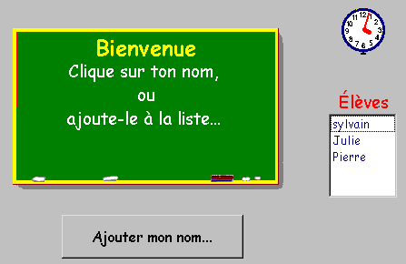 En l'absence de classes spécifiques, le seul choix offert à l'élève est l'ajout de son nom dans la classe des visiteurs. Si cet élève n'en est plus à sa première visite, il peut cliquer son nom dans la liste des noms figurant déjà dans la liste des élèves sinon, il utilisera le bouton ajouter mon nom... pour ajouter son nom à la liste.