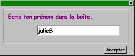Après avoir choisi sa classe, l'élève doit entrer son nom. Ici les étapes d'identification sont les mêmes que pour les visiteurs. Le logiciel ne permettra pas d'avancer tant que l'élève ne se sera pas nommé. Il serait du ressort de l'enseignant de s'assurer que les élèves ayant les mêmes prénoms les terminent par la première lettre de leur nom ou par tout autre signe distinctif. Rappelons que le nom donné par l'élève lui sert en quelque sorte de mot de passe lui permettant d'entrer dans le logiciel et dans les textes qu'il aura réalisés précédemment.