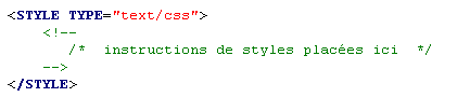 Notez dans cette instruction, la présence de la balise de commentaire. Insérée à l'ouverture de l'instruction, elle assure qu'une page lue par un navigateur non familier avec les instructions de style ne soit pas dérouté, il ignorera simplement ces instructions.