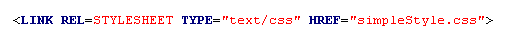 Cette instruction, comme la précédente est généralement faite dans la section HEAD du document HTML. Elle se lit comme suit: l'instruction LINK possède l'attribut REL=STYLESHEET instruit le navigateur qu'il trouvera une feuille de style, de type TYPE="text/css" à l'adresse URL (HREF=)"simpleStyle.css".